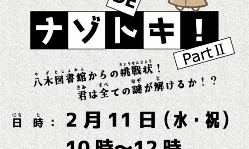 岸和田市の八木図書館で、建国記念の日の2月11日(水)に「祝日おたのしみ会」が開催されます。当日は分館も通常どおり開館し、館内イベントとして「図書館でナゾトキ…