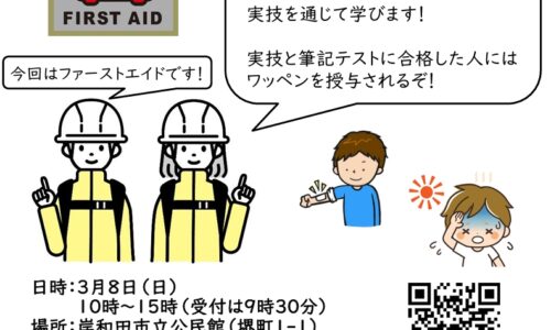 岸和田市立公民館で、応急手当を学ぶ体験型講座「1Dayサバイバル体験【ファーストエイド】」が3月8日(日)に開催されます。対象は小学4~6年生で、災害時や日常…
