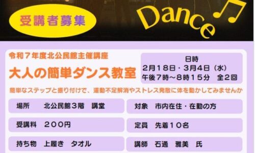 泉大津市内の南公民館・北公民館では、2月受付の各種講座を実施します。健康づくりや趣味、リフレッシュを目的とした内容で、市内在住・在勤・在学者が対象です。申込み…