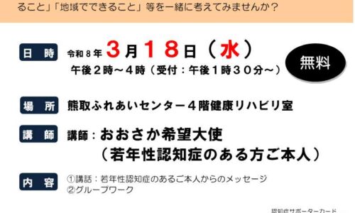 熊取町では、認知症サポーター養成講座の受講修了者を対象に、「認知症ステップアップ講座」を開催します。認知症への理解をさらに深め、本人や家族を地域でどう支えてい…