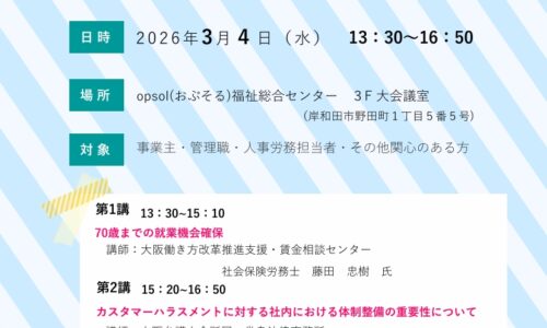 【貝塚市】第29回「知って得する労働問題講座」開催 ハラスメント対策や70歳就業を学ぶ