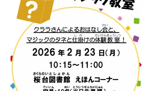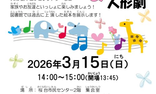 桜台図書館は3月15日(日)、桜台市民センターで「人形劇すまいる」によるミニおはなし会&人形劇を開催します。家族で楽しめる読み聞かせと人形劇のイベントです。…