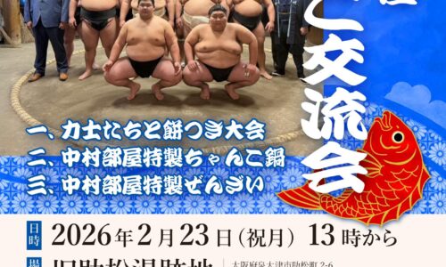大相撲大阪場所の期間中、泉大津市に拠点を構える「中村部屋」による地域貢献イベント「中村部屋~ちゃんこ交流会~」が、2月23日(月・祝)午後1時から旧助松湯跡地…