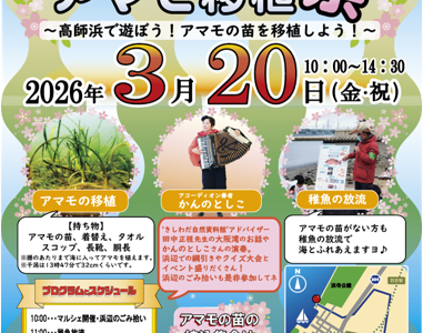 高石漁港内の砂浜で2026年3月20日(金・祝)、砂浜活性化プロジェクト第6弾が開催されます。漁師汁の無料配布(先着300人)や朝市マルシェ、稚魚放流、アマモ…