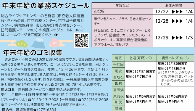 年末年始は、ごみ収集や市役所・公共施設の業務が通常と異なります。高石市が発表したスケジュールを、分かりやすくまとめました。
