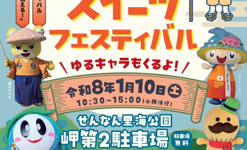 日本遺産「葛城修験」をテーマにしたグルメイベント「葛城修験スイーツフェスティバル」が、2026年1月10日(土)、せんなん里海公園(岬第2駐車場)で開催されます。開催時間は10時30分から15時までで、小雨決行、荒天時は中止となります。