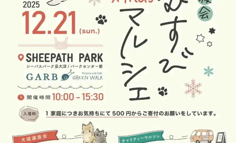 泉大津市のシーパスパークで12月21日(日)、犬猫の譲渡会「X’masえんむすびマルシェ」が開催される。時間は午前10時から午後3時30分まで。会場はシーパスパーク・パークセンター前。