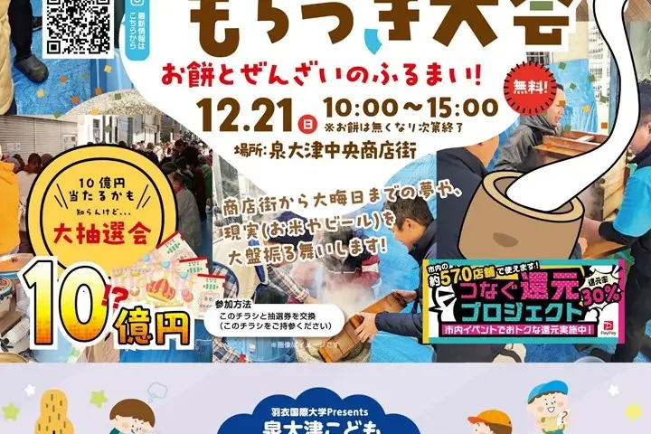 泉大津中央商店街のSNSによると、恒例行事となりつつある餅つき大会で、来場者は餅つき体験に参加できるほか、きなこ餅やぜんざいの無料振る舞い(※なくなり次第終了)も予定されている。