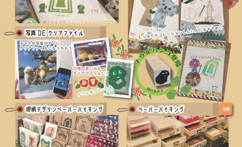 目玉企画は、ハンコ押し放題・マスキングテープ貼り放題で行うノート作り体験。新作の「ナウルくん」ハンコも登場し、万博の思い出づくりにも活用できるという。参加費は15分350円、1時間1000円。道具はすべて用意されており、手ぶらで参加できる。
