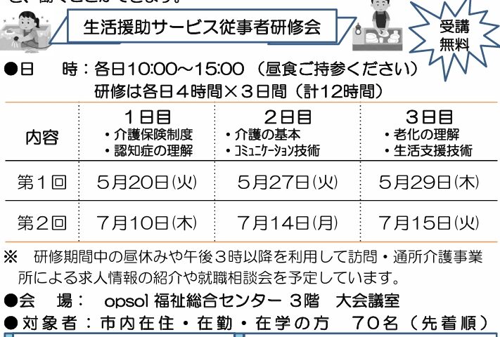 岸和田市は、介護予防・日常生活支援総合事業に基づく訪問型サービスに従事する人を養成するため、生活援助サービス従事者研修を実施する。現在、令和8年2月開催分の受講申込みを受け付けている。