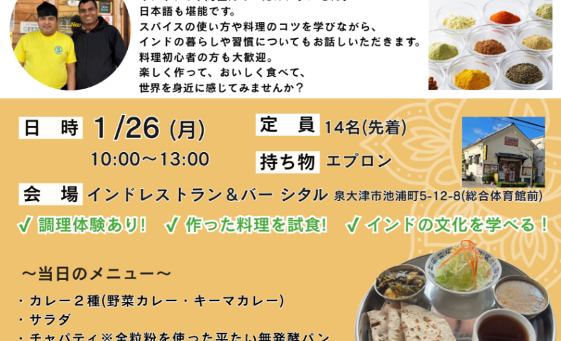 泉大津市内の飲食店を訪問し、外国料理の調理体験を通じて海外の文化や暮らしを学ぶイベント「エキゾチックキッチン」が開催されます。