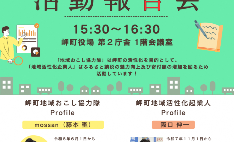 地域おこし協力隊は、地域の課題解決や魅力発信を目的に町内で活動しており、地域活性化起業人は、主にふるさと納税の魅力向上や寄付額の増加に向けた取り組みを行っている。今回の報告会では、それぞれの活動内容が紹介される予定。