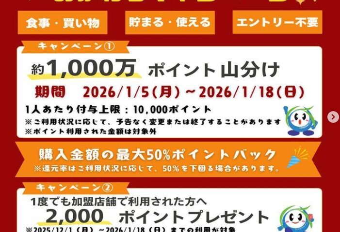 第2弾キャンペーンでは、2026年1月5日から1月18日までの期間中、加盟店舗での利用金額に応じてポイントが付与される。還元率は最大50%で、1人あたりの付与上限は1万ポイント。また、期間中に1度でも加盟店舗を利用した人には、2,000ポイントが別途付与される。
