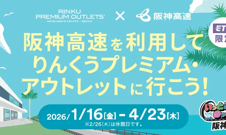 阪神高速道路と三菱地所・サイモンは、阪神高速を利用して来場すると特典が受けられるキャンペーンを1月16日から4月23日まで実施する。阪神高速4号湾岸線「泉佐野南」「泉佐野北」出口をETCで利用し、りんくうプレミアム・アウトレットを訪れた来場者に、ノベルティグッズと割引クーポンシートを配布する。詳細や利用条件は特設サイトで案内している。