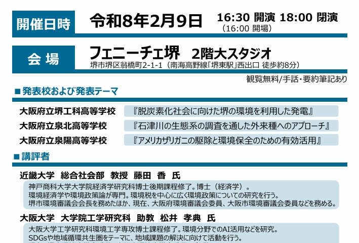 堺市では、環境問題をテーマに課題研究活動を行う市内高校を支援しており、2月9日(月)にその成果発表会をフェニーチェ堺で開催します。市内の高校生が取り組んできた環境課題研究の成果を発表するもので、どなたでも観覧可能です。