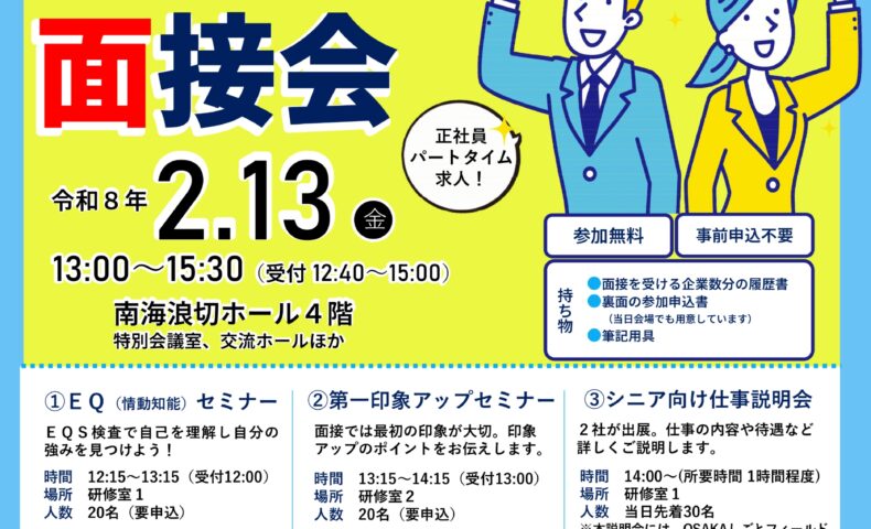 当日は面接会に加え、EQ(情動知能)セミナーや第一印象アップセミナー(いずれも要申込)、シニア向け仕事説明会も実施される。面接会は事前申込不要で、当日会場で参加申込書を提出すれば参加できる。開催時間は13時から15時30分まで(受付は12時40分開始)。