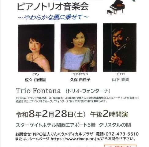 泉佐野市で2月28日、市民を対象とした文化講演会 「ピアノトリオ音楽会~やわらかな風に乗せて~」 が開催される。健康推進と音楽をテーマにした催しで、参加費は無料、定員は先着200人となっている。