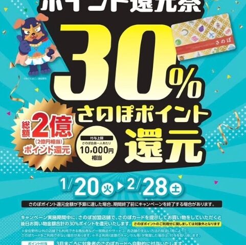 案内によると、期間中にさのぽ加盟店で買い物をした金額に対し、最大30%分のポイントが還元される。還元の上限は1人あたり10,000ポイントで、さのぽポイントを使った支払い分は還元対象外となるため注意が必要だ。