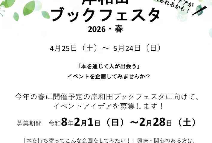 岸和田市立図書館は、4月25日から5月24日に開催予定の「岸和田ブックフェスタ2026・春」に向け、イベントアイデアの公募を行っている。テーマは「本を通じて人が出会う」。読書や本をきっかけに、人と人がつながる企画を広く募集する。