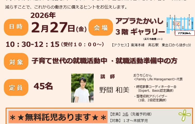 高石市はハローワーク泉大津と共催で、子育て世代の就職・再就職を支援する「マザーズ就活準備セミナー」を2月27日に開催する。テーマは「仕事も生活もスムーズに!暮らしを整える整理収納講座」。家事や育児に追われる日常を見直し、これからの働き方に備える内容となっている。