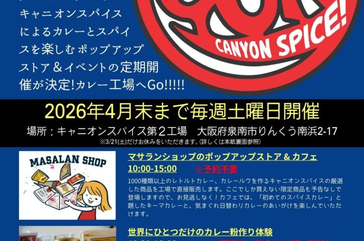 泉南市りんくう南浜にあるキャニオンスパイス第2工場で、カレーとスパイスをテーマにした「ポップアップストア&カフェ」が、2026年1月から4月末までの期間、ほぼ毎週土曜日に定期開催される。