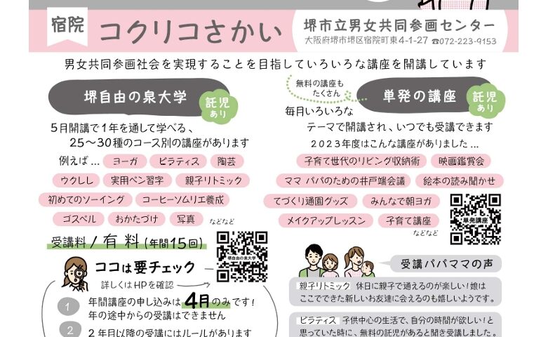 いずれの事業も参加費は無料。気象警報発令時は中止となる場合がある。申し込み方法や詳細は、堺市電子申請システムまたは北区子育て支援課で確認できる。
