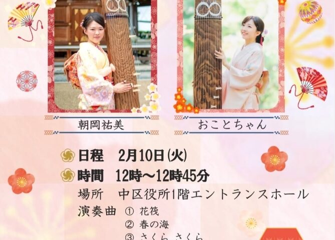 堺市中区では2月10日、区役所内で気軽に日本の伝統音楽に触れられる「ひるどきコンサート」を開催する。区民が身近な場所で芸術を楽しむ機会を設け、地域文化の振興を図る取り組みの一環。今回は箏(こと)の二重奏が披露される。