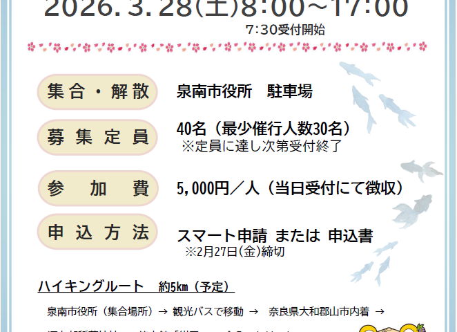 7:30 受付開始/8:00 出発/17:00 解散(予定) - 集合・解散:泉南市役所 駐車場
