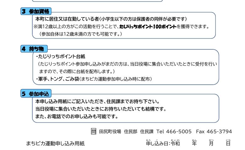 - 内容:役場または自宅を出発してごみ拾いを行い、役場に集合