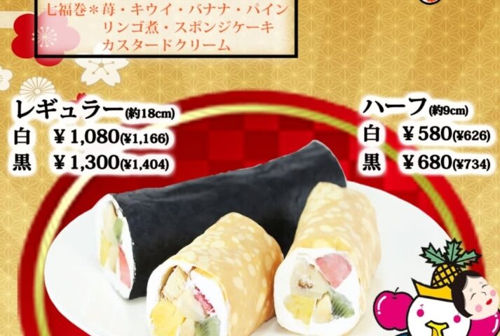 サイズは約18センチのレギュラーと約9センチのハーフの2種類。白いクレープ生地のタイプは当日購入が可能で、海苔巻きのような見た目を再現した黒いタイプは、前日までの予約制となっている。