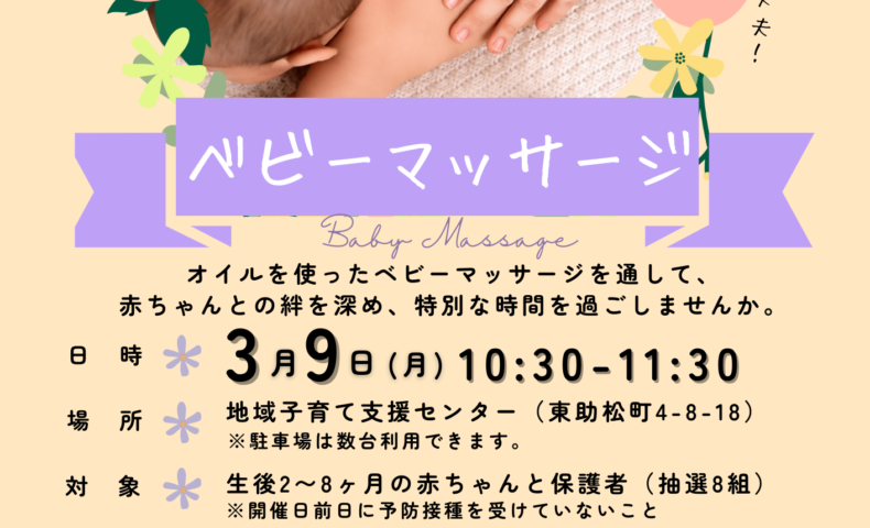 泉大津市の地域子育て支援センターでは、子育て講座の一環として、ベビーマッサージ講座を2026年3月9日(月)に開催する。