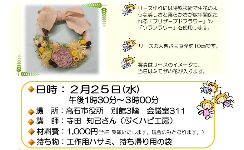 高石市は、2月25日(水)に「男女共同参画すてっぷ講座」として、ミモザをあしらったリース作りを開催します。