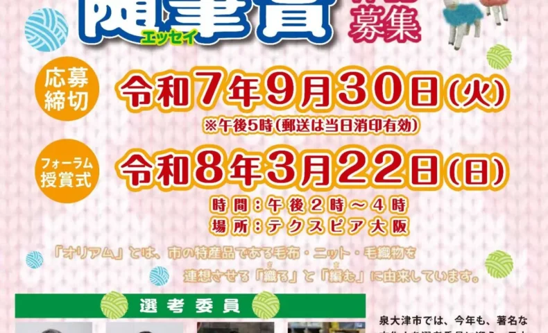 「オリアム随筆賞」は、市制施行70周年事業として創設され、「繊維のまち・泉大津」をPRする目的で続けられてきた文学賞。衣服や繊維製品にまつわる思い出や感動をテーマにしたエッセイを全国から募集している。