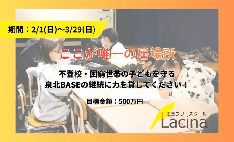 堺市と富田林市で不登校の子どもや家庭を支援する特定非営利活動法人「志塾フリースクールラシーナ」が、支援体制を持続させるためクラウドファンディングを開始した。目標金額は500万円、期間は3月29日まで。