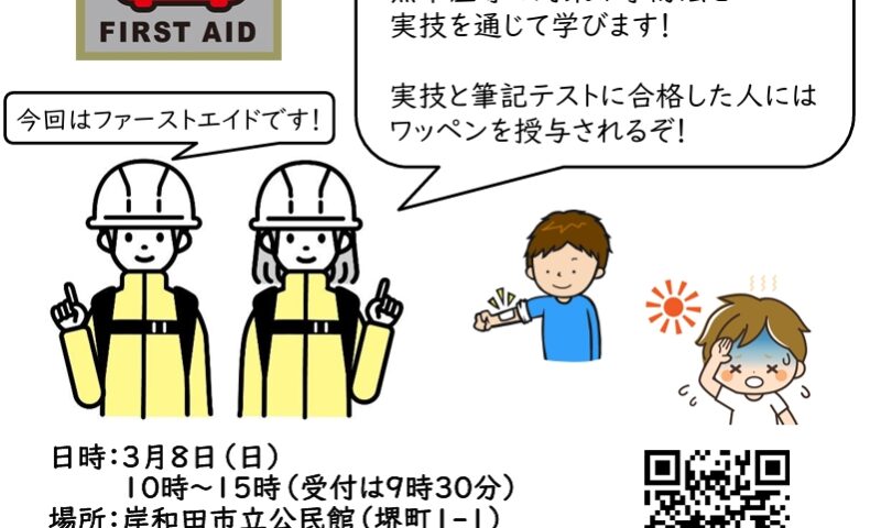 岸和田市立公民館で、応急手当を学ぶ体験型講座「1Dayサバイバル体験【ファーストエイド】」が3月8日(日)に開催されます。対象は小学4~6年生で、災害時や日常で役立つ“いざという時の対応力”を身につける内容です。