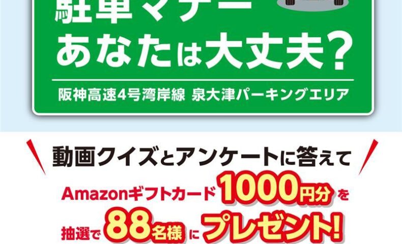 阪神高速道路株式会社は、4号湾岸線・泉大津PA(海側・陸側)の駐車場利用マナー向上を目的に、クイズ&アンケートを実施しています。実施期間は2026年3月8日(日)までです。