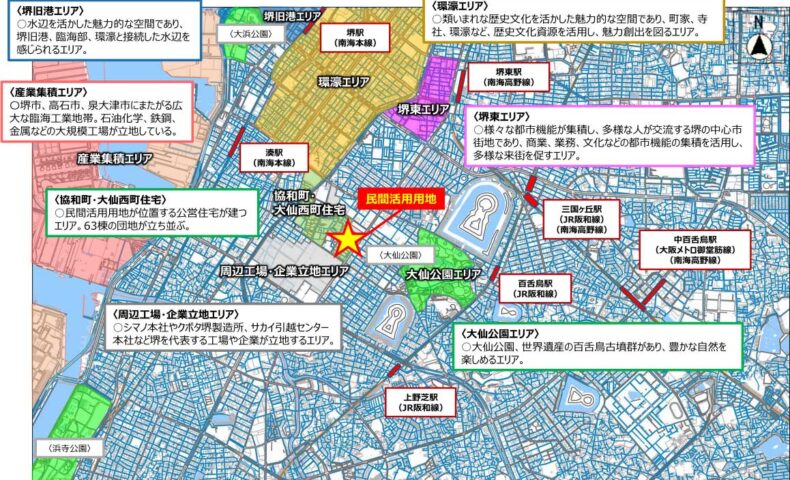 対象地は、堺区の中心市街地・南海高野線堺東駅から南西約2kmに位置します。市営住宅の建て替えにより管理戸数を約600戸削減・移転することで、新たにまとまった土地が生まれます。堺市は「大仙西校区まちづくりグランドデザイン(2025年改訂)」を踏まえ、地域の将来像に沿った民間活用を目指しています。