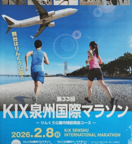 泉佐野市のりんくう公園・りんくうアイスパーク周辺で、**「第33回KIX泉州国際マラソン」2月8日(日)**に開催されます。会場は、南海空港線・JR空港線「りんくうタウン」駅からすぐの場所です。