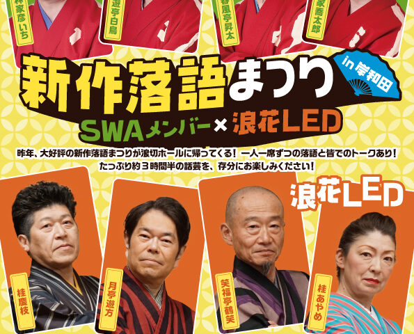 東京から出演するのは、創作落語を牽引してきたユニット「SWA(創作話芸アソシエーション)」の林家彦いちさん、三遊亭白鳥さん、春風亭昇太さん、柳家喬太郎さん。一方、上方勢は桂あやめさん、桂慶枝さん、笑福亭鶴笑さん、月亭遊方さんによるグループ「浪花LED」が迎え撃つ。