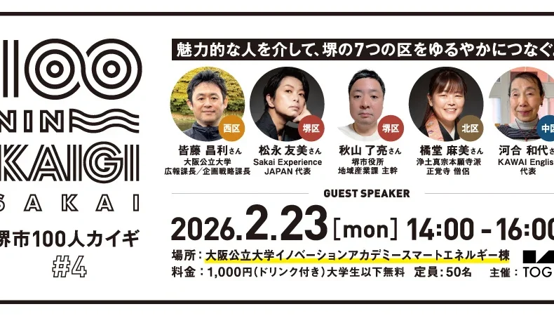 堺市で活動する多様な人々のストーリーを掘り起こし、ゆるやかな人的ネットワークを育むトークイベント「堺市100人カイギ Vol.4」が、2月23日(月・祝)に大阪公立大学中百舌鳥キャンパスで開催される。