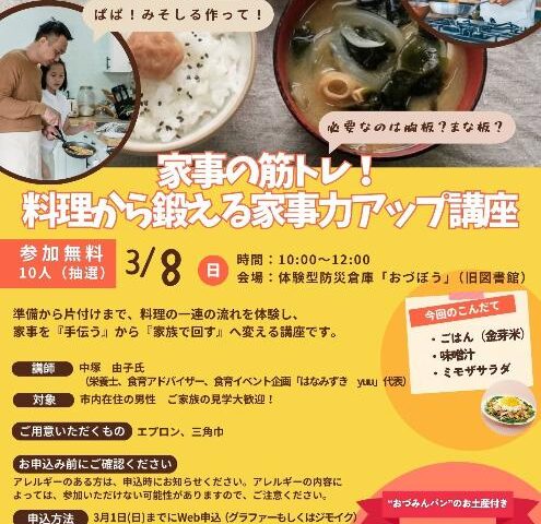 講師は、栄養士で食育アドバイザーの中塚由子さん(食育イベント企画「はなみずき Yuu」代表)。会場は体験型防災倉庫「おづぼう」で、当日は公共交通機関または自転車での来場が求められている。