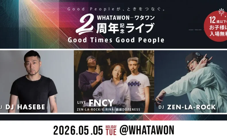 大阪府岸和田市の滞在型エンターテイメントモール「WHATAWON(ワタワン)」は、開業2周年を記念し、主催音楽フェス「Good Times Good People」を2026年5月4日(月)〜6日(水)の3日間開催する。音楽を軸に、グルメ、ファッション、カルチャーが交差するアニバーサリーイベントだ。
