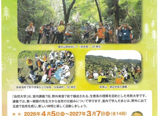 NPO法人「自然と緑」は、生態系や自然との共生を体系的に学ぶ「自然大学」第31期の受講生を募集している。毎日新聞社などが後援。講義と野外実習を組み合わせた市民向けの環境学習プログラムで、2026年4月5日から2027年3月7日まで実施される。