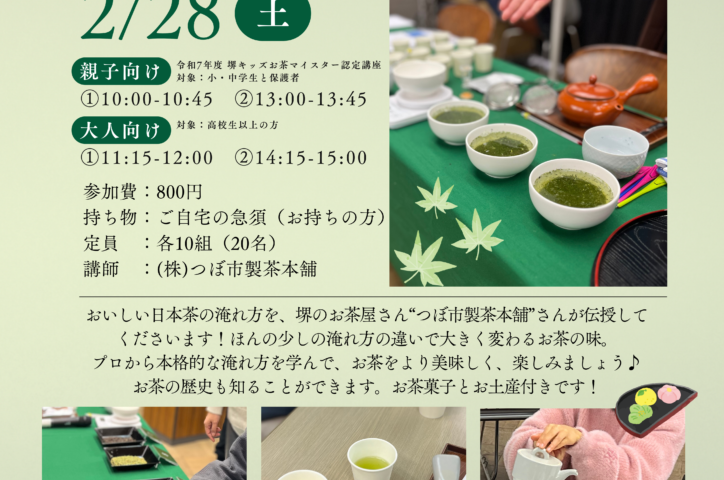 2026年2月28日(土)、堺市都市緑化センターで、日本茶の淹れ方を学べる体験講座が開催されます。講師は堺の老舗茶舗 つぼ市製茶本舗。プロの技を間近で学び、煎茶の味の違いを体感できる内容です。
