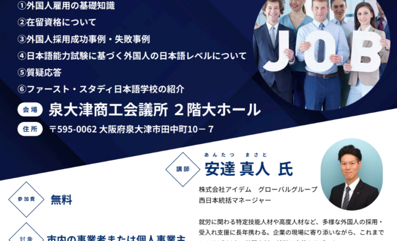 泉大津市の泉大津国際交流協会は、市内で外国人労働者の雇用を検討している事業者向けに「外国人就労セミナー」を開催します。申込締切が延長され、現在も参加申込を受け付けています。