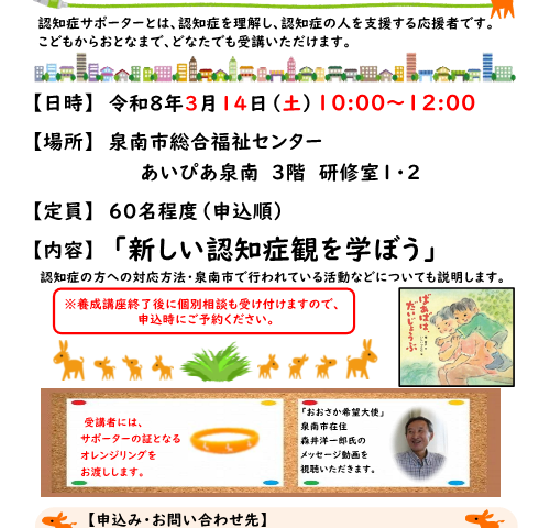 泉南市は、令和8年3月14日(土)午前10時から12時まで、泉南市総合福祉センターあいぴあ泉南3階研修室1・2で「認知症サポーター養成講座」を開催します。定員は60人(申込順)。
