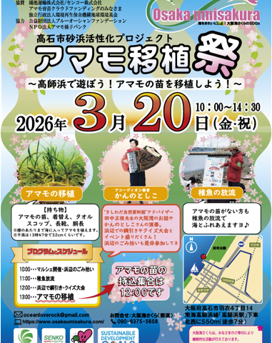 アマモ移植祭はNPO法人大阪海さくらの協力により実施。海のゆりかごと呼ばれるアマモを高師浜に植えます。腰のあたりまで海に入るため、アマモの苗、着替え、タオル、スコップ、長靴、胴長の持参が必要です。