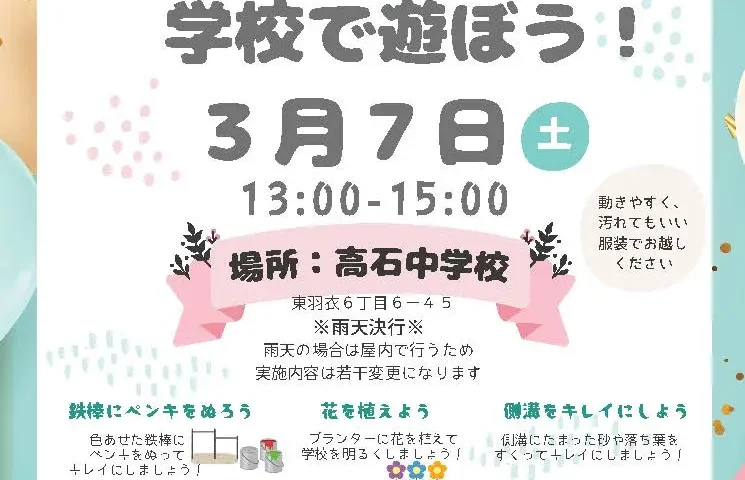 3月15日(日)13時~15時、高石市立高石中学校(高石市東羽衣6-6-45)で「学校をキレイにしよう&学校で遊ぼう!@高石中学校」が開催される。参加費は無料で、大人も子どもも参加できる地域イベントだ。