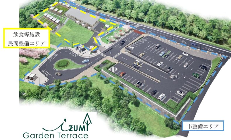 新たに整備される施設名はIZUMI Garden Terrace(イズミガーデンテラス)。全天候型のBBQエリアに加え、カフェテラスやドッグラン付きBBQエリアを備える計画で、公園利用の幅が広がりそうだ。