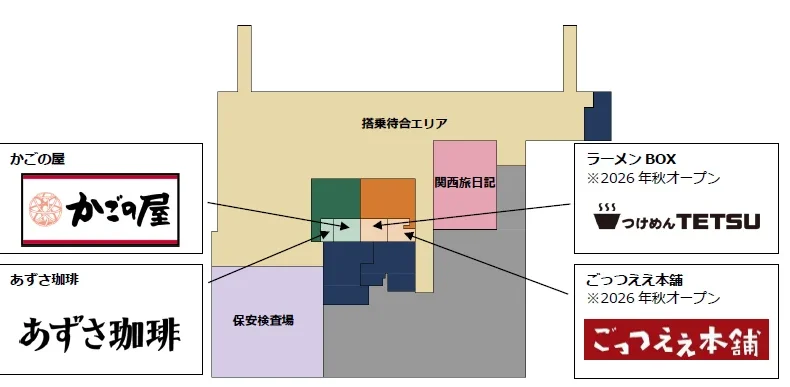 新設されるフードコートは営業時間5:30~20:15(フライト状況により変更あり)。4月1日に「あずさ珈琲」「かごの屋」が先行オープンし、2026年秋に「ラーメンBOX」「ごっつええ本舗」が加わる予定。「ラーメンBOX」第1弾にはつけめんTETSUが登場する。